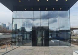 На входе в пункт продаж расположен стол ресепшен, выполненный из мрамора и тонированного стекла. В оформлении офиса прослеживается единый лаконичный и современный стиль. Отделка помещения соответствует облику премиального жилого комплекса.